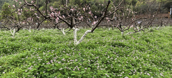 在桃园观摩点,紫云英长势喜人,繁茂的植株不仅有效抑制了杂草滋生,其根际的根瘤更在默默固氮,为桃园土壤积蓄天然肥力。“控草培肥效果太明显了!”种粮大户周世波对紫云英套种的显著成效赞不绝口。