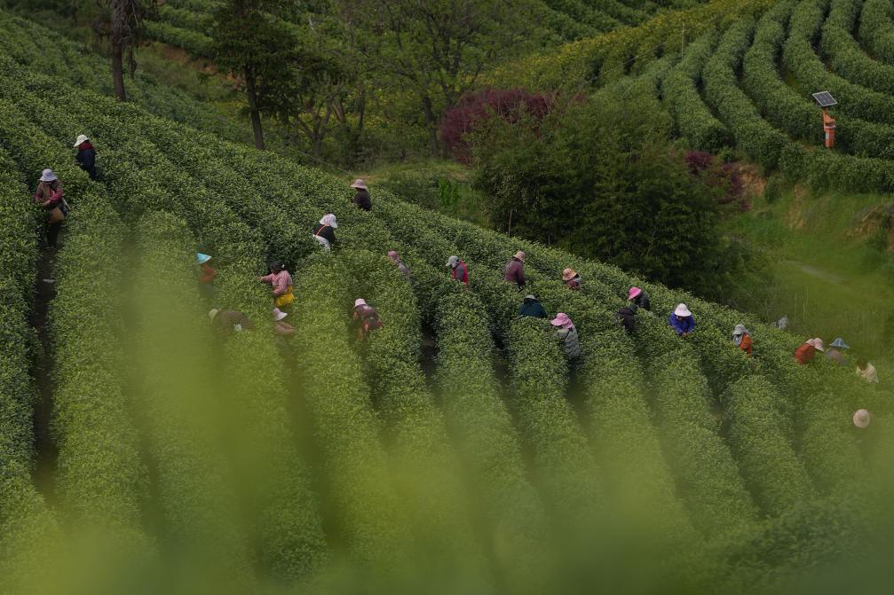 3月19日,梅家坞村的茶农在茶山上采摘西湖龙井“明前茶”。新华社记者徐昱 摄